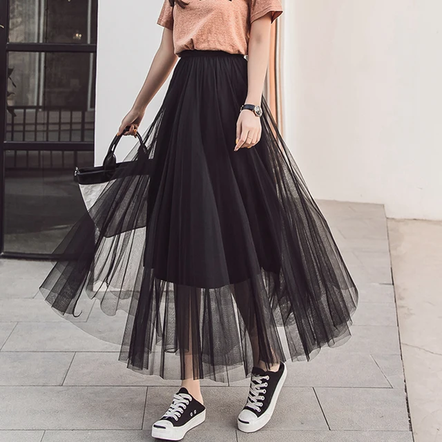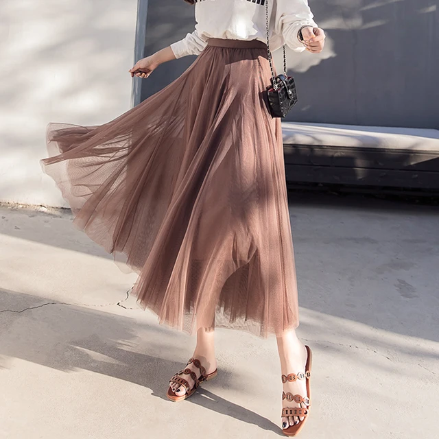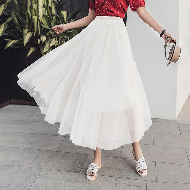 XuanNuo New 2019 Women Long Midi Skirt Spring Summer Ladies Mesh Feather Embrodery Flared Tutu Skirt High Waist Female