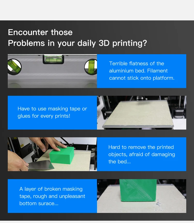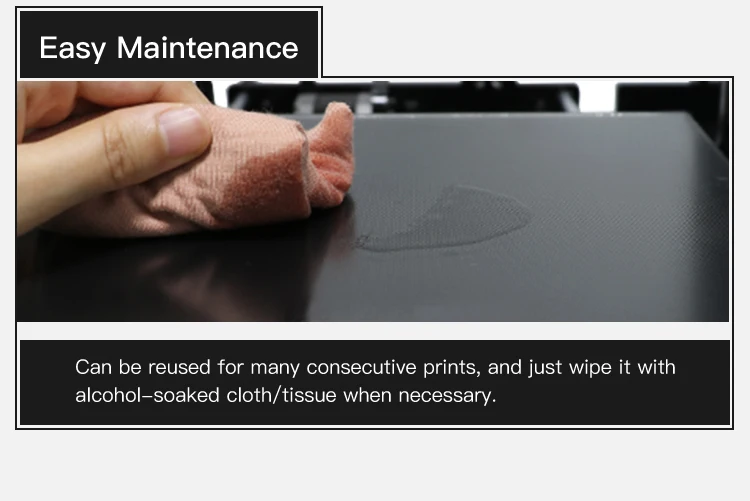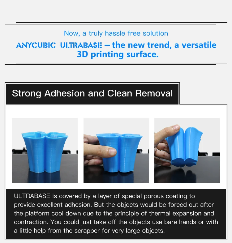 1.Excellent adhesion: Ultrabase covered by microporous coating, shows strong adhesion in printing. Easy to take off models by hand or with a little help from the scrapper for very large models.