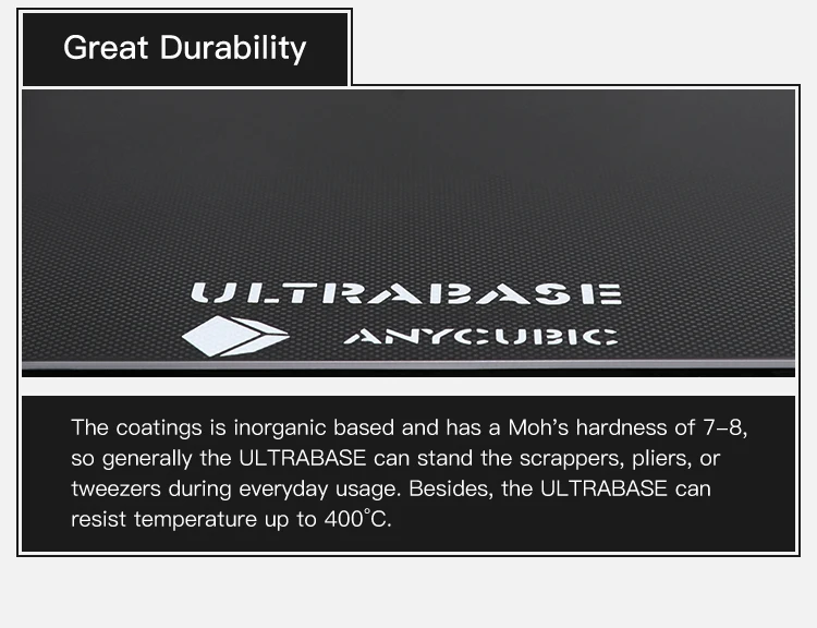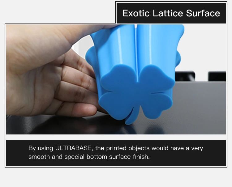 2.Ultrabase integrated with heated bed: Super Flatness, Fast and uniform heating.