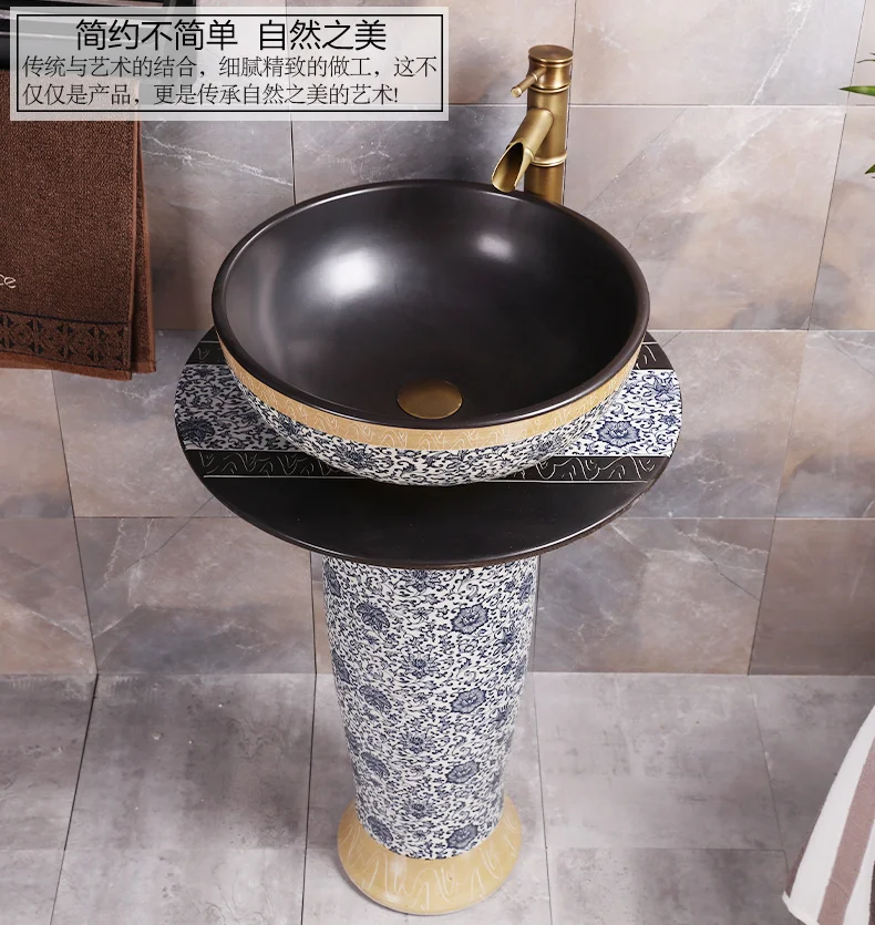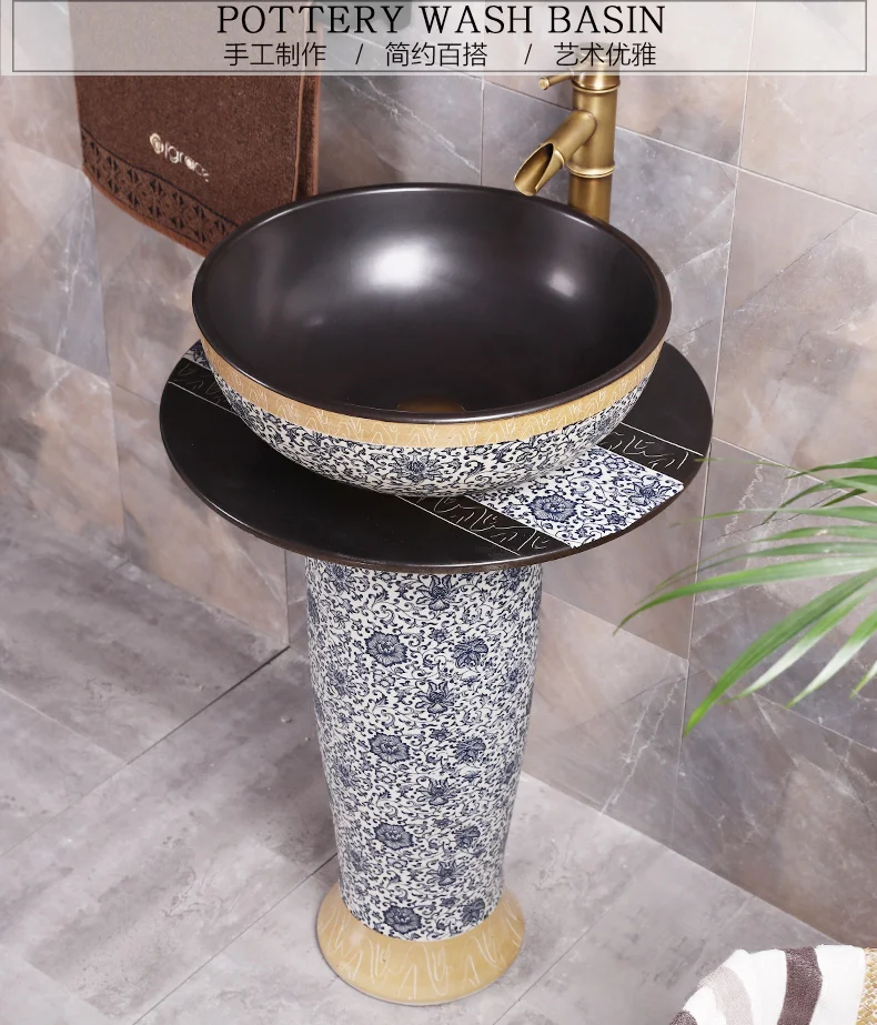 Monite Art Antique Bathroom Sink Set Round Ceramic Vessel Sink With Waterfall Faucet With Black Inside